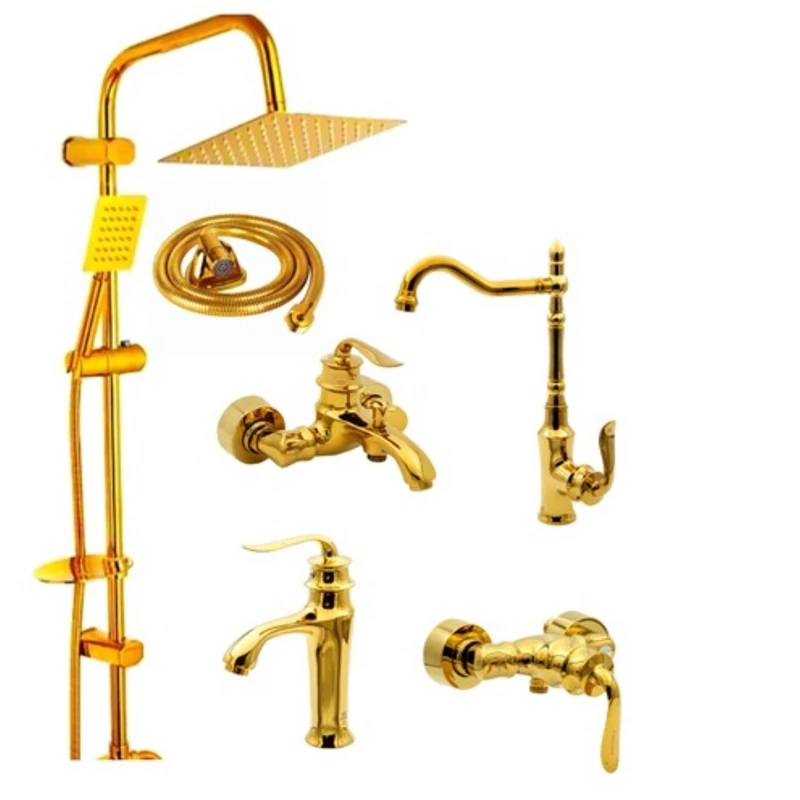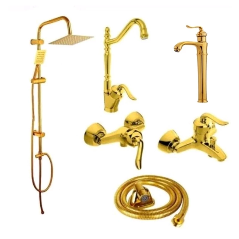 ست 6 تایی شیرآلات قاجاری طلایی با روشویی پایه بلند و علم دوش مربع دو کاره و شیلنگ توالت ایران گروه