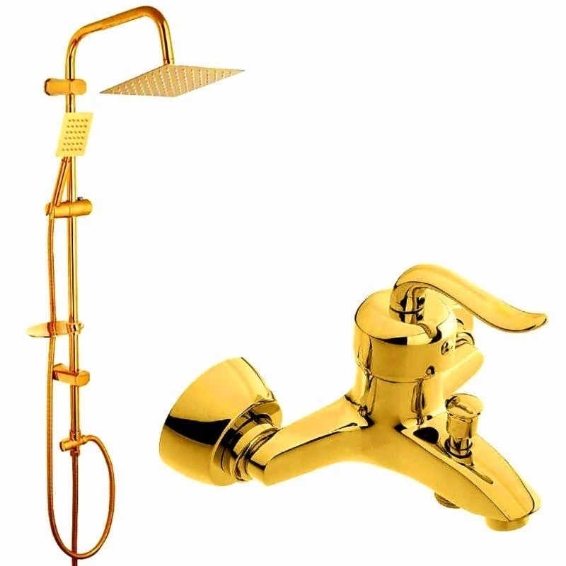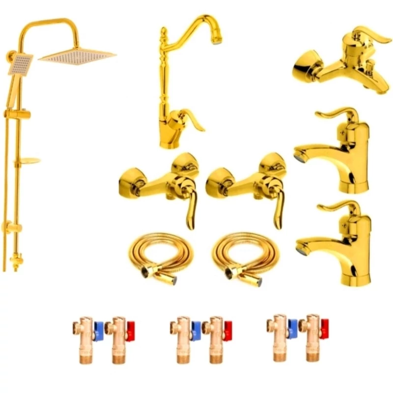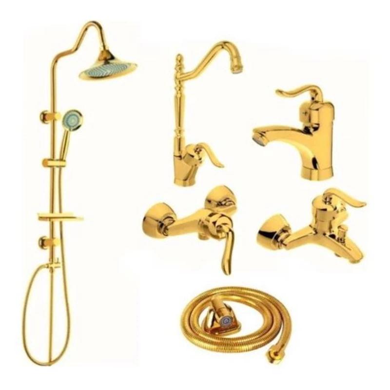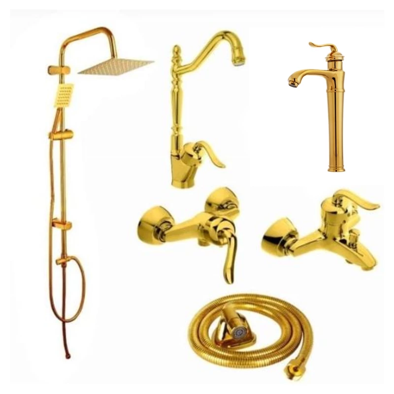 ست 10 تایی شیرآلات قاجاری طلایی با علم دوش تک کاره و شیلنگ توالت و شیر پیسوار(پس کرایه)