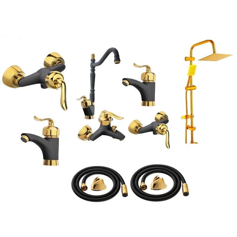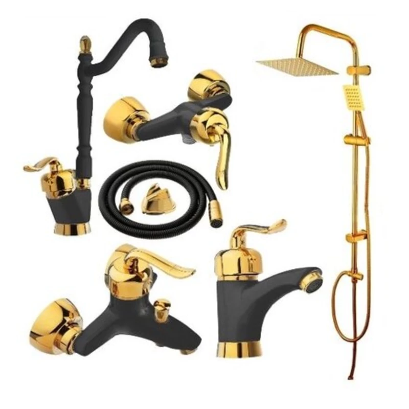 ست 6 تایی شیرآلات قاجاری مشکی طلایی با علم دوش دوکاره و شیلنگ توالت(پس کرایه)