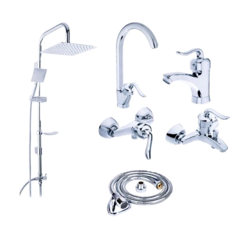 ست 10 تایی شیرآلات قاجاری کروم با علم دوش دوکاره مربع استیل و شیلنگ توالت (پس کرایه)