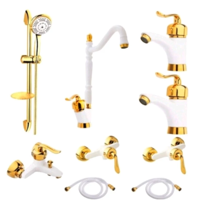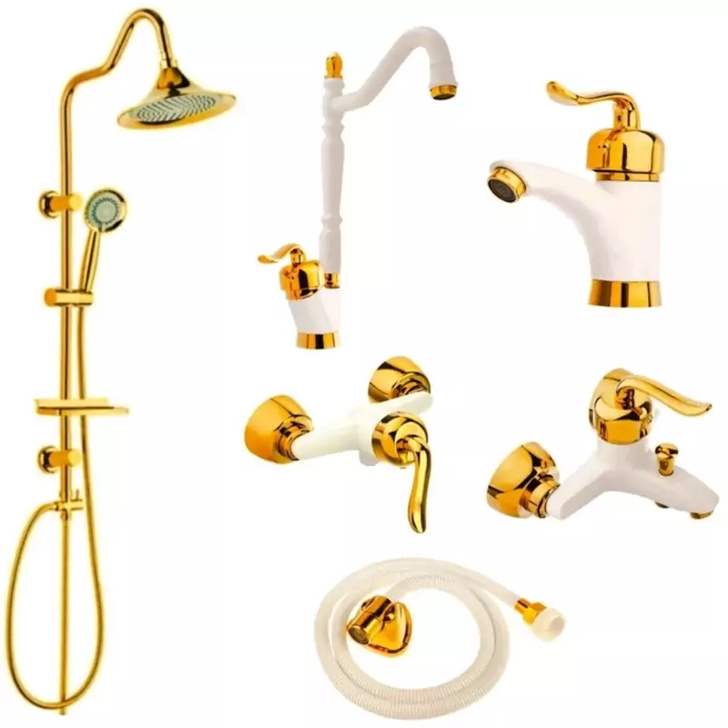 ست 6 تیکه شیرآلات قاجاری سفید طلایی با علم دوش شیپوری و شیلنگ توالت(پس کرایه)