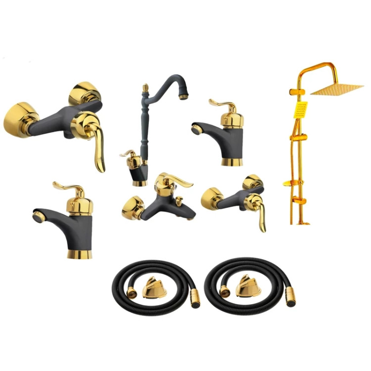 شامل: 1عدد شیر دوش- 1عدد شیر ظرفشویی- 2 عدد شیر روشویی - 2عدد شیر آفتابه - 2عدد شیلنگ توالت مشکی طلایی - 1 عدد علم دوش دوکاره طلایی