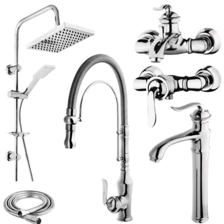 شامل : 1عدد شیر روشویی پایه بلند - 1عدد شیر آفتابه - 1عدد شیر دوش - 1عدد شیر ظرفشویی فنری - 1عدد علم دوش مربع کروم - 1عدد شیلنگ توالت کروم