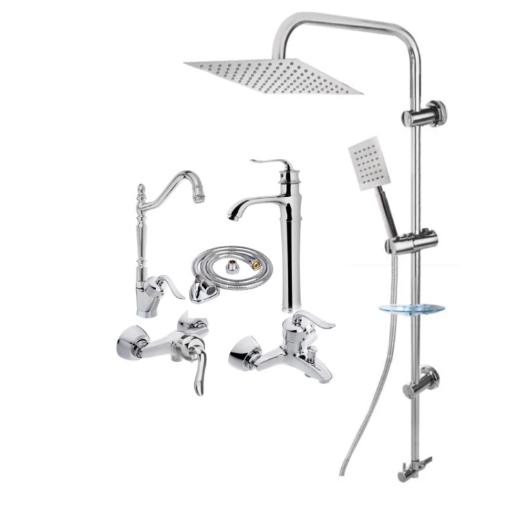 شامل : ۱عدد شیر روشویی پایه بلند (مناسب روشویی سنگی )-۱عدد شیر ظرفشویی- ۱عدد شیر دوش - ۱عدد شیر آفتابه- ۱عدد علم دوش دوکاره مربعی کروم - ۱عدد شیلنگ توالت ریز بافت