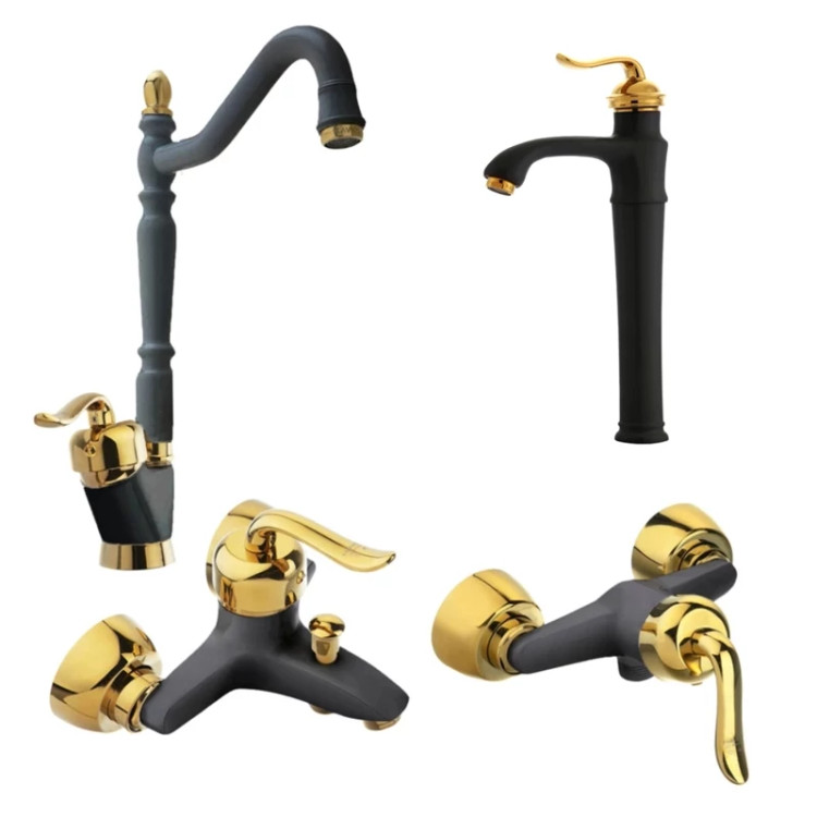 ست 4 تیکه شیرآلات قاجاری مشکی طلایی با شیر روشویی پایه بلند (پس کرایه)
