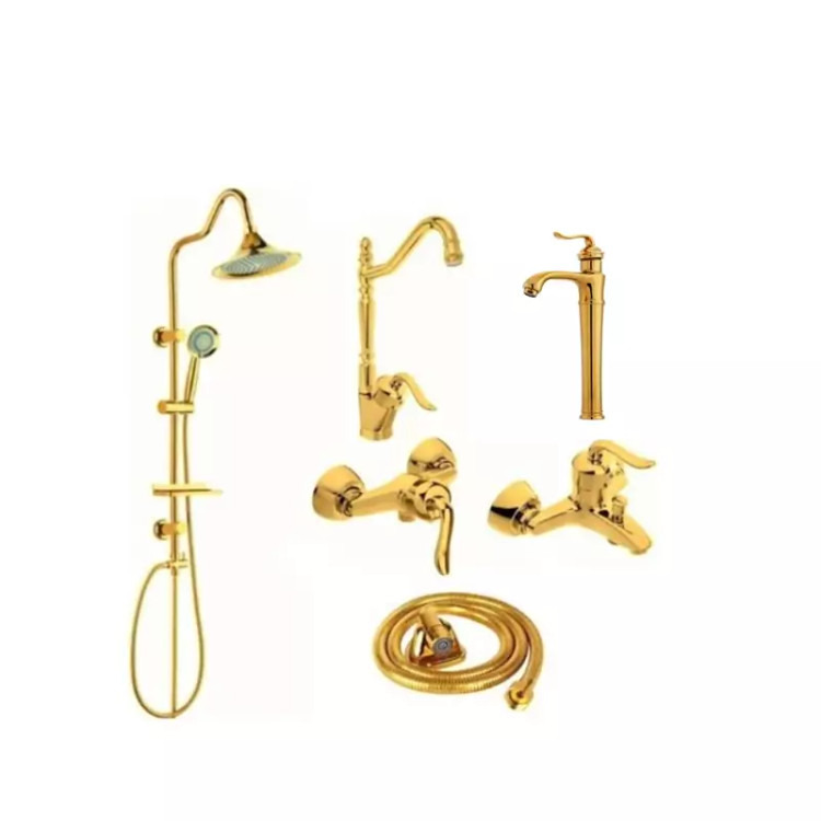 ست 6 تایی شیرآلات قاجاری طلایی با روشویی پایه بلند و علم دوش شیپوری و شیلنگ توالت (پس کرایه)