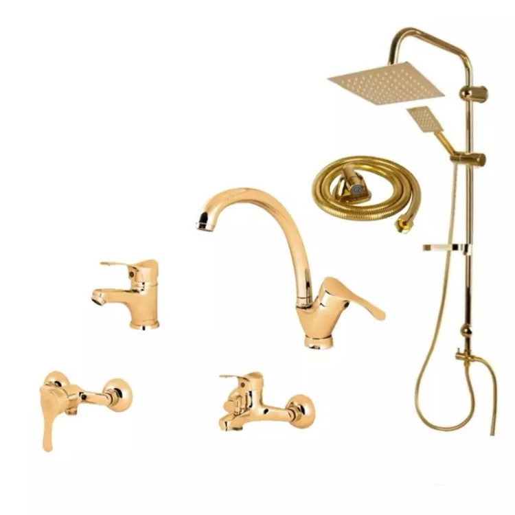 شامل : 1عدد شیر روشویی - 1عدد شیر دوش - 1عدد شیر آفتابه - 1عدد شیر ظرفشویی- 1عدد شیلنگ توالت طلایی ریز بافت - 1عدد علم دوش دوکاره مربع طلایی