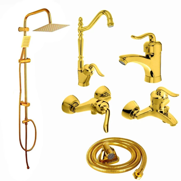 ست ۶ تیکه شیرآلات قاجاری طلایی شامل : شیر روشویی-شیر ظرفشویی-شیردوش-شیرآفتابه -علم دوش دوکاره مربعی - شیلنگ توالت ریز بافت